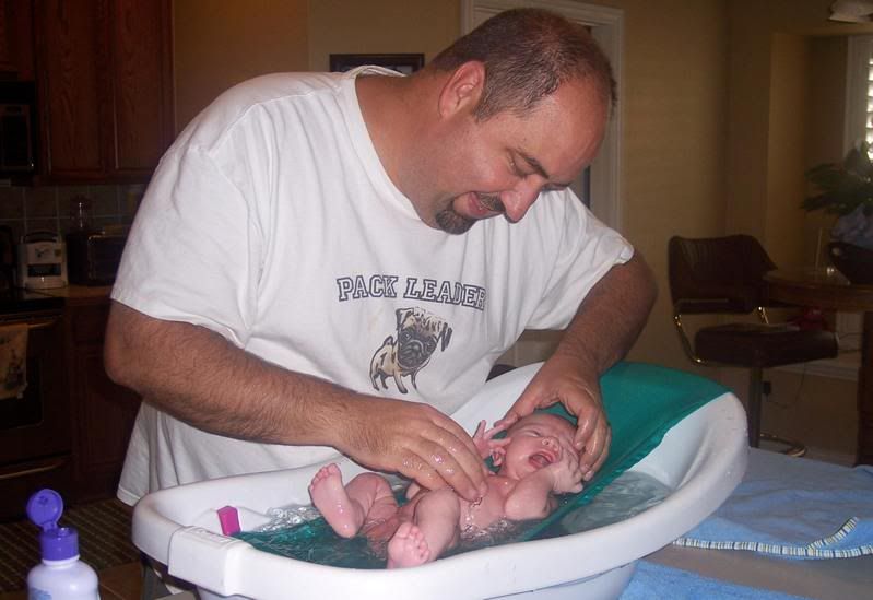 A photo can't always accompany many "Milestones" - like a first smile, which probably won't come right when a camera is poised and ready. But, the first bath was definitely a Kodak moment. Even got some good video. We had to wait until his umbilical cord completely fell off before we could submerge him in water. For some reason, the books like "Baby 411" say to give a baby his first bath just before a feeding. So, once he got all riled up and fussy and hungry, we drew a bath in the little tub that Kelley loaned us, which was also used for Riley and Reagan. Kathy and I took turns bathing and doing camera duties.