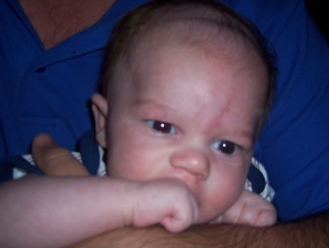 Face #1 - This is the early stage, when hunger is imminent. He does not suck his thumb, but will suck a hand or wrist. Getting the sucking muscles warmed up.